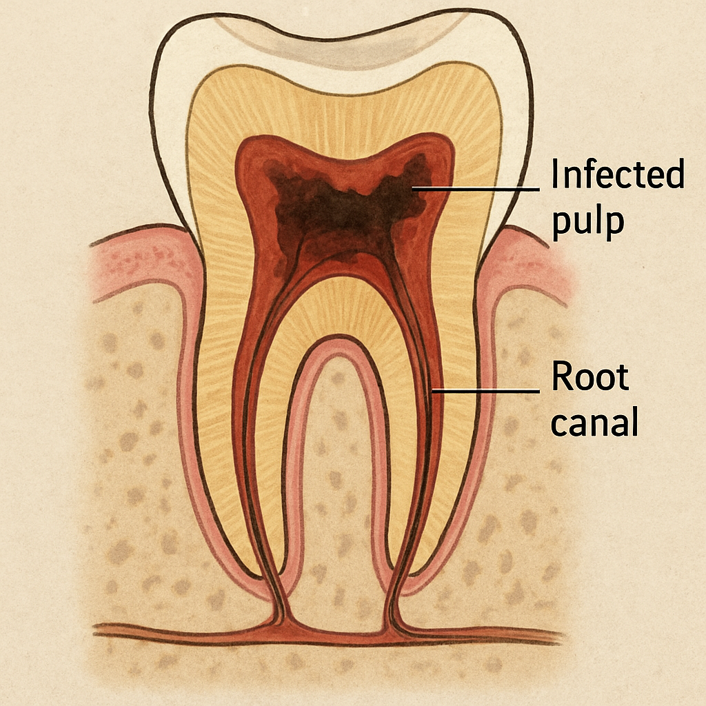 A root canal is a treatment to repair and save a tooth that is badly decayed or infected. The procedure involves removing the damaged area of the tooth (the pulp), cleaning and disinfecting it, and then filling and sealing it. This process eliminates bacteria and prevents future infections, preserving the natural tooth structure.